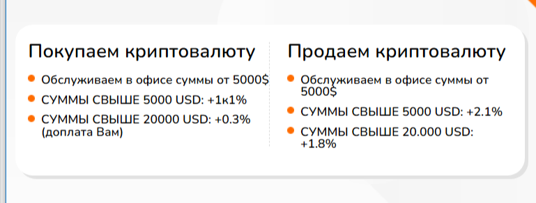 Размер комиссии зависит от выбранной криптовалюты и итоговой суммы обмена. Например, при обмене от 20 тысяч долларов, клиент получает вознаграждение в 0,3%.