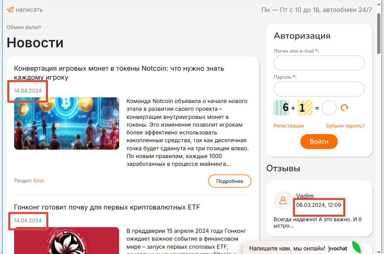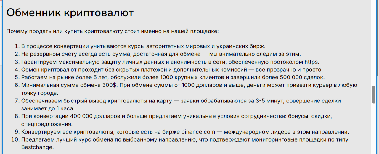 Главная страница встречает формой для обмена и списком резерва. Даже без регистрации пользователь может ознакомиться со всеми условиями сотрудничества и совершить сделку. Здесь же содержатся основные сведения о самой компании, полезные статьи и инструкции по совершению сделки.