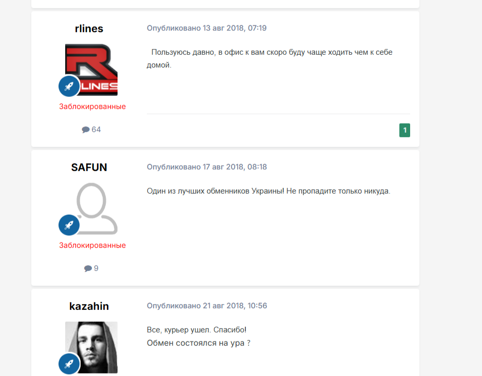 За многолетний срок работы валютник собрал множество отзывов. Он активно сотрудничал с проверенными мониторинговыми сервисами. Практически все клиенты довольны сотрудничеством. Они отмечают быстроту сделок, невысокие комиссии и отличный персонал. Причем это касается и операторов, и сотрудников физического офиса. Пользователи отмечают безупречную вежливость и максимальный профессионализм.