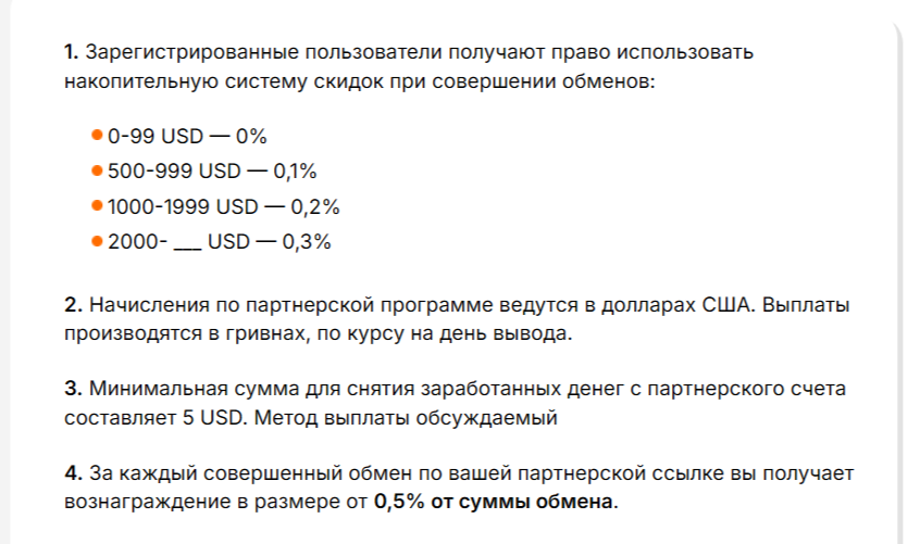 Также дополнительные бонусы доступны зарегистрированным пользователям. Общая сумма обменов накапливается и создает дополнительную скидку. Еще можно получить вознаграждение по реферальной программе. Она имеет одну ступень. За каждый обмен по личной реферальной ссылке можно получить от 0,5% от общей суммы.