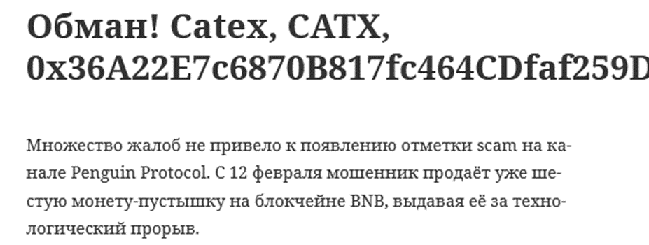 С начала февраля 2026 года на некоторых мониторингах появилось предупреждение о попытках продажи токенов-пустышек. Среди них – мем-коин CATEX. Вероятно, у кого-то на руках остались монеты, владельцы которых хотят избавиться от них таким не совсем легальным способом.