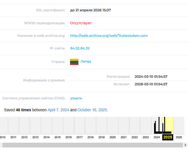 О владельцах компании и разработчиках монеты ничего не сказано. На официальном сайте эта информация не была опубликована, сторонние сервисы данными сведениями также не располагают. Проверка сайта catextoken com показала, что он был зарегистрирован в марте 2024 года через Литву. Архивные данные подтверждают, что в первый год работы на домене сохранялась активность, но уже с начала 2025 проект кажется заброшенным.