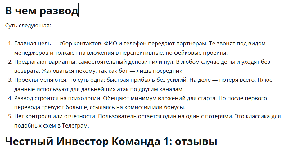 Анализ деятельности «Частный инвестор Команда 1» показывает, что это мошенническая схема, которая направлена на выманивание предоплаты и кражу персональных данных. Сотрудничать с фирмой опасно по следующим причинам: