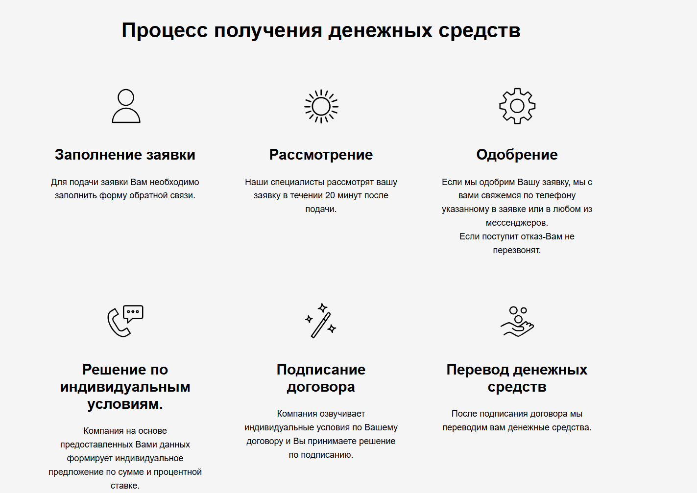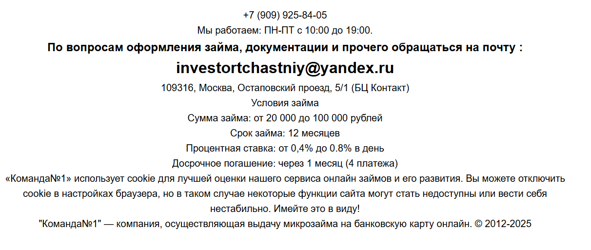 «Частный инвестор Команда №1» предлагает займы от 20 000 до 100 000 рублей на срок до 12 месяцев. Ставка — от 0,4% до 0,8% в день, что в годовом выражении составляет от 146% до 292%. Это превышает установленный законом максимум для МФО. После заполнения подробной анкеты с паспортными данными заявителю перезванивают в течение 20-30 минут и сообщают, что заявка предварительно одобрена.
