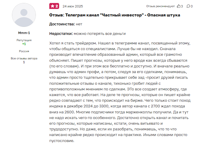Этот так называемый «Частный Инвестор» — просто очередной анонимный «гуру», который обещает золотые горы, а на деле не предоставляет ни четких прогнозов, ни реальных результатов. Публикации редкие и размытые, а отсутствие фундаментального анализа говорит о поверхностном подходе. Накрученные подписчики и положительные эмодзи в комментариях не скрывают того факта, что заработать с этим проектом практически невозможно. Не дайте себя обмануть — держитесь подальше от подобных «экспертов».