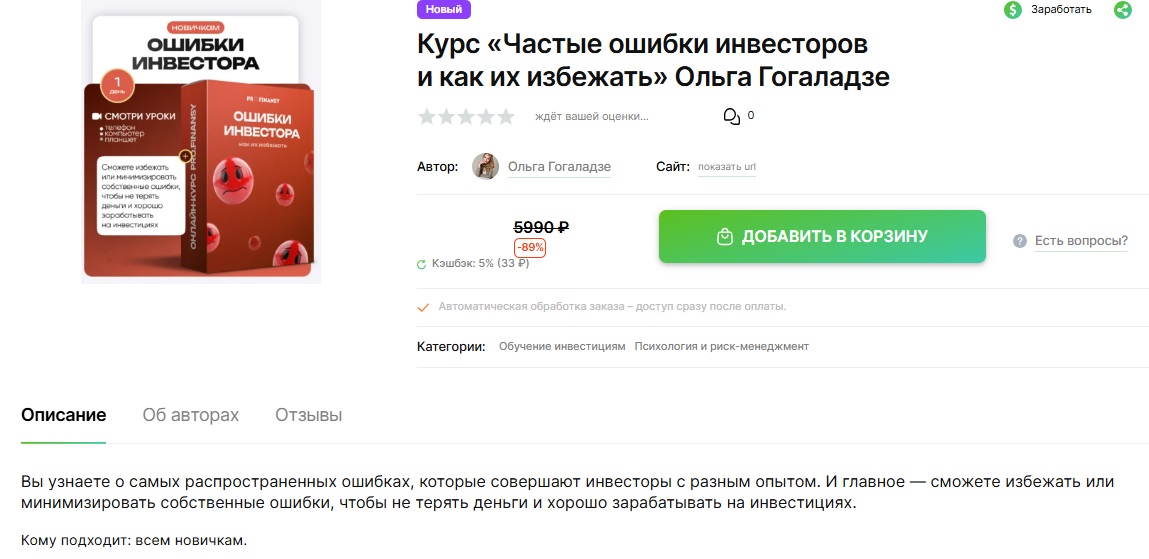 Курс «Частые ошибки инвесторов и как их избежать» от Ольги Гогаладзе вызывает сомнения: отсутствие обратной связи, поверхностный материал и агрессивный маркетинг с навязыванием дорогих программ. Цена в 5990 руб. за 49 минут видео и чек-листы без практики кажется завышенной.