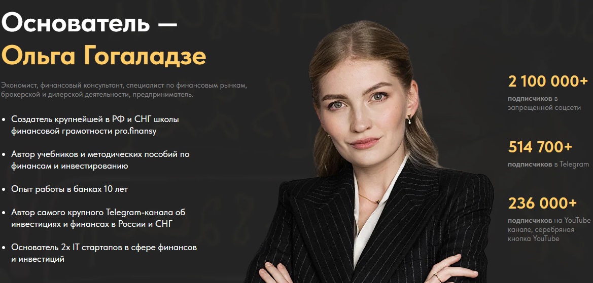 Автор курса “Частые ошибки инвесторов и как их избежать” — Ольга Гогаладзе: коуч, фундатор одной из самых крупных в СНГ финансовых академий PRO FINANSY, популярный блогер и обладательница серебряной кнопки Ютуба.