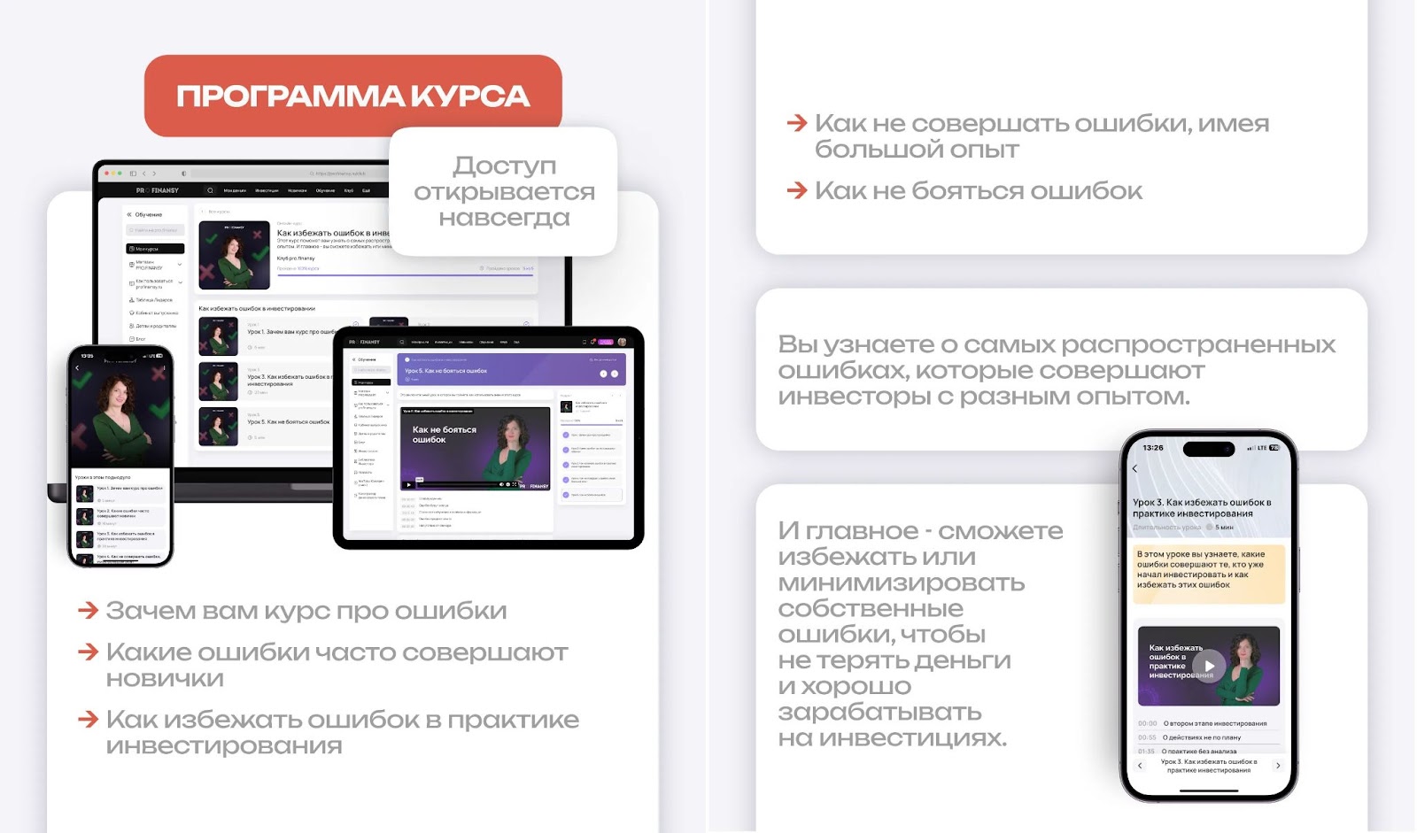Новый курс “Частые ошибки инвесторов и как их избежать” вышел в 2025 году, его программа состоит из пяти блоков: