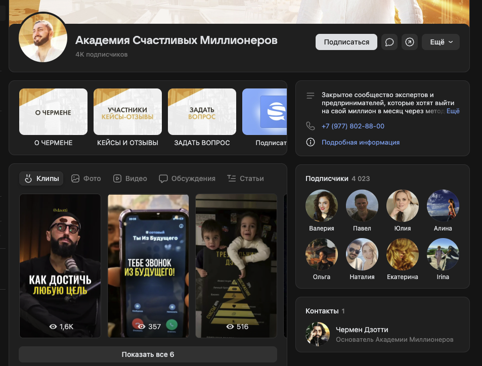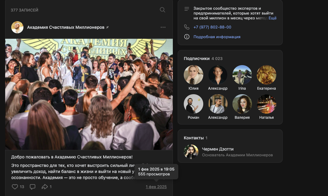 Там же есть сообщество компании Дзотти – Академии Счастливых Миллионеров: