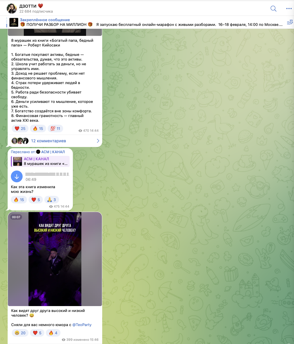 Основной социальной сетью, в которой продвигает свои услуги самый богатый психолог – Телеграм-канал Дзотти. На сообщество подписано 22 тысячи человек. Но посты просматривает около 500 человек.