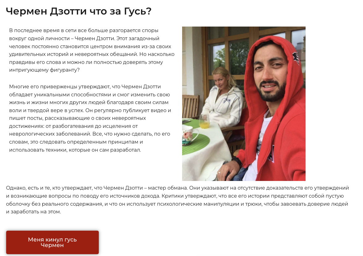 В сети даже есть сайт, посвященный разоблачению Чермена Дзотти, где его называют мошенником и гусем: