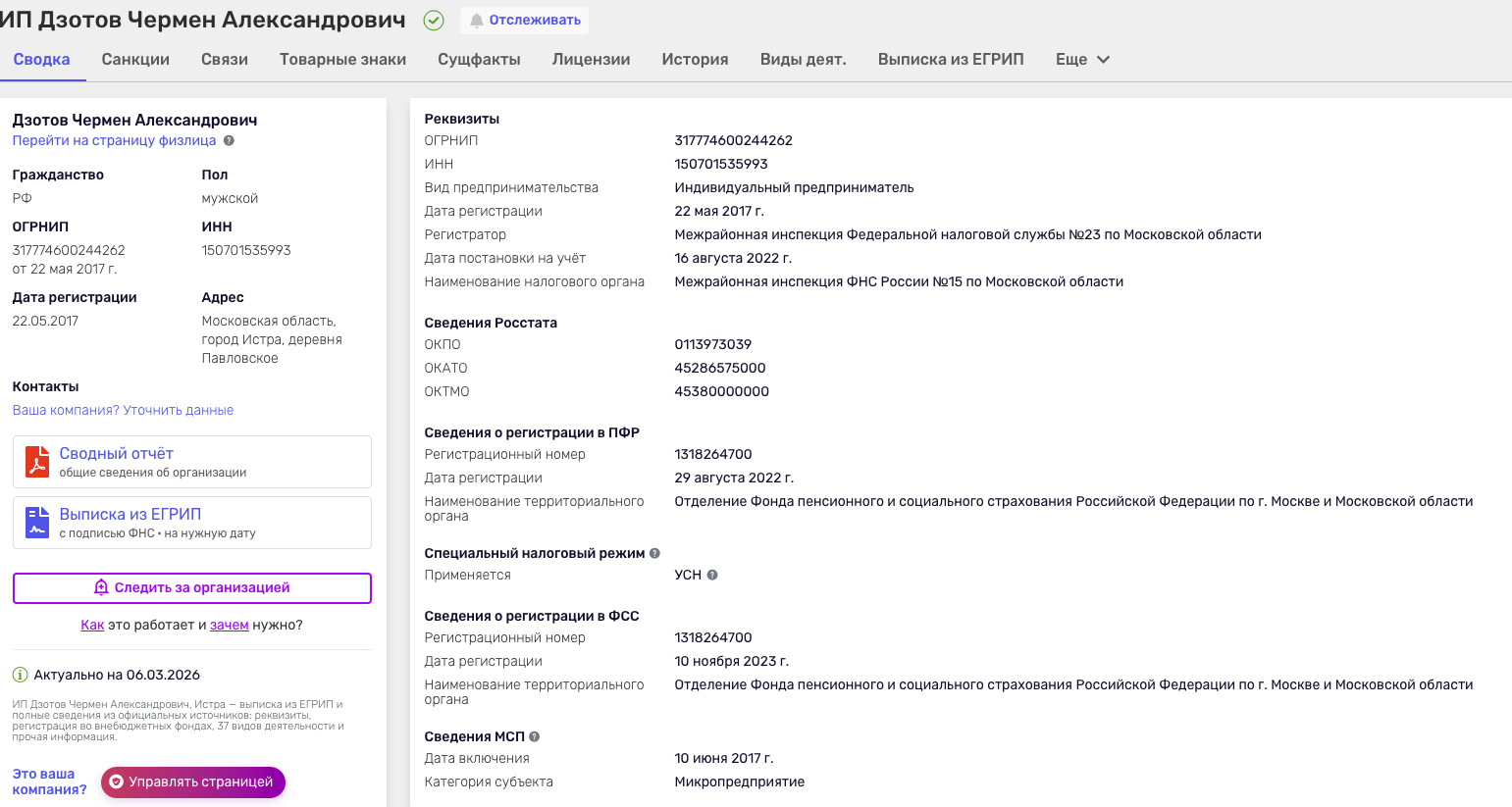 Кроме того, у Дзотова открыто ИП. Судя по всему, через него проходят несметные деньги, о которых рассказывает автор.