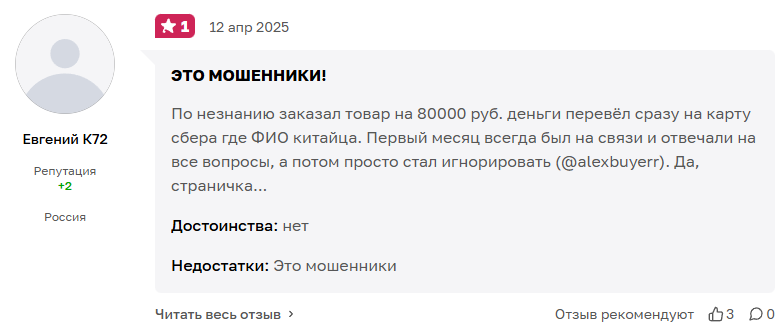 Мужчина потерял 80 тысяч рублей при заказе техники. Сначала менеджер активно консультировал и помогал. После перевода денег начались бесконечные отговорки. Через месяц ожидания alexbuyerr перестал выходить на связь. Еще один клиент лишился 100 тысяч при попытке купить партию квадроциклов для бизнеса.