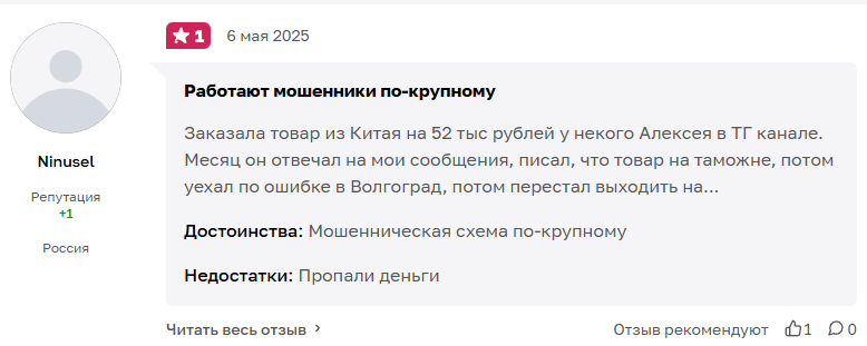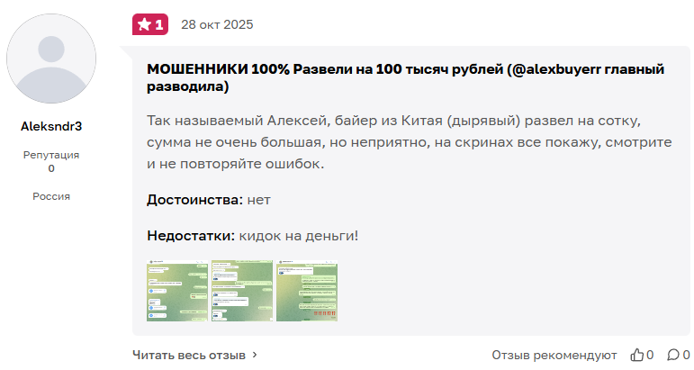 В сети мы нашли шесть отзывов о Alexbuyerr. Все они исключительно негативные. Люди описывают одинаковую схему обмана. Суммы потерь варьируются от 52 000 до 100 000 рублей.