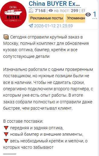 «Чайна байер экспресс» специализируется на выкупе с китайских маркетплейсов. В описании указаны Таобао, 1688 и POIZON. Связь идет через менеджера Алекса байера в Телеграме. Ассортимент широкий – от смартфонов до автозапчастей.