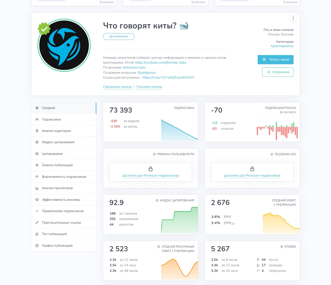 Вся система каналов от создателей «Что говорят киты» построена вокруг подачи крипто-аналитики, публикаций о прибыльных сигналах и предложений по рекламе. Рекламодатели могут через Demaxcrypto и Adsgenius покупать размещение на канале или в партнерских крипто-каналах, а для трейдеров проект обещает профессиональный подход, качественную аналитику и платную рекламу для продвижения. Есть бесплатные новости и базовые обзоры, платный контент — сигналы и подробная статистика. Все это подается как большой плюс для тех, кто хочет продавать свои услуги или быстрее заработать на трейдинге.