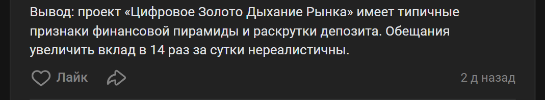 - О проекте «Цифровое Золото | Дыхание Рынка» есть негативные рецензии в Сети, так что сотрудничество может нести для инвесторов риск попасть на развод.