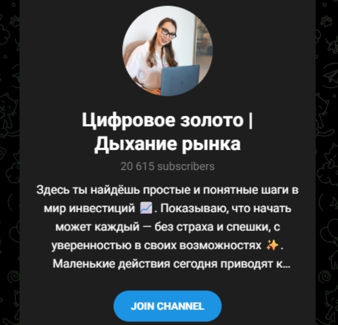 Отметим, что на 20.02.2026 канал «Цифровое Золото | Дыхание Рынка» в Телеграмм не доступен, но о нем есть сведения в Сети. Так, на пике его аудитория насчитывала 20 615 подписчиков, а в описании автор делает акцент на простоте и доступности инвестирования. Указывается, что здесь можно найти понятные шаги к пассивному заработку, а начать якобы сможет каждый – без страха, спешки и с уверенностью в своих силах. Также продвигается идея постепенного роста капитала через маленькие действия сегодня.