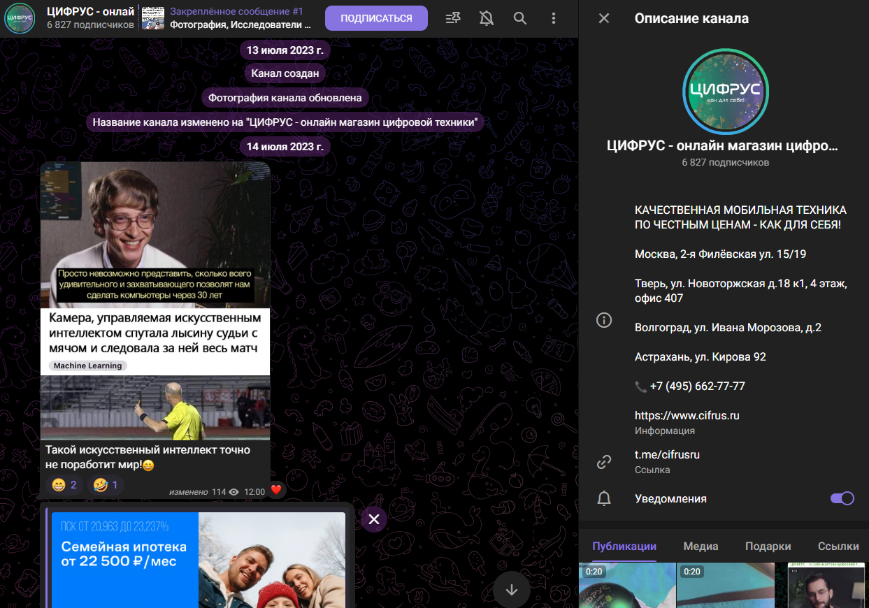 Переходник «Цифрус» в Телеграм был зарегистрирован 13 июля 2023 года. Здесь можно найти актуальную информацию по новым поступлениям товаров, новые акции и просто интересные новости – например, о самом большом созданном тетрисе в Дубае.