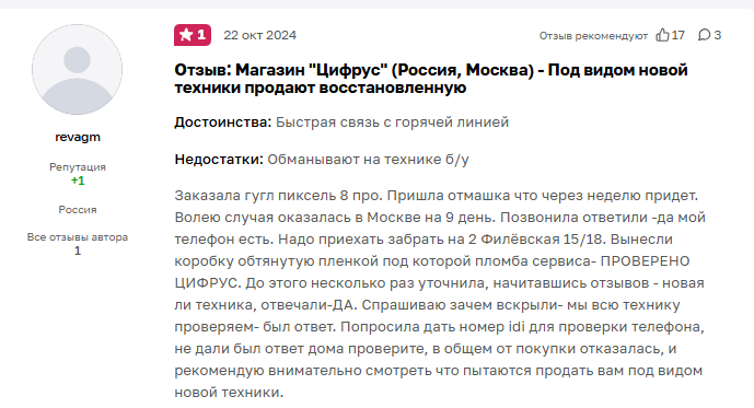 Сомнительно, что компания с 17-летним стажем и 300 000 довольных клиентов не предоставляет возможность оставить отзыв на сайте. Отсутствие прозрачности и негативные комментарии о продаже восстановленной техники под видом новой вызывают серьезные сомнения в надежности «Цифрус».
