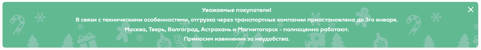 Онлайн-магазин предупреждает, что в связи с техническими особенностями отгрузка через транспортные компании приостановлена до 3 января 2026 года – это первое объявление, которое видит посетитель сайта. Уточняется, что данное ограничение не распространяется на Москву, Тверь и еще несколько городов.