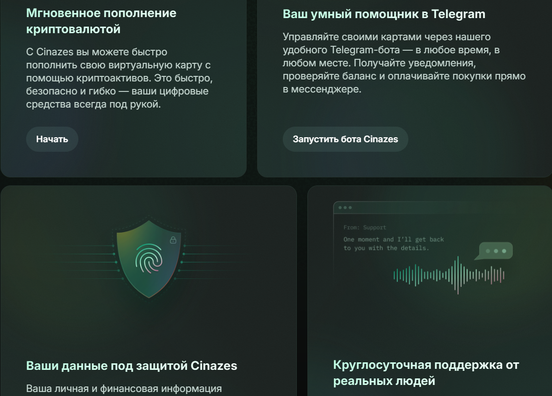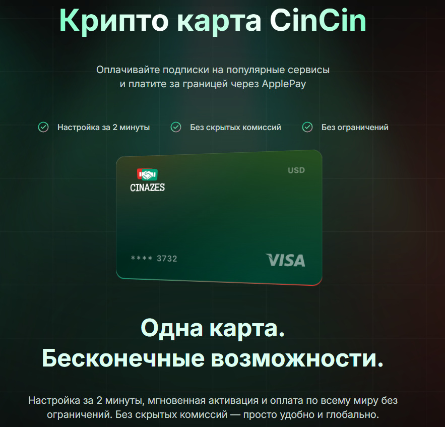Cinazes Card — это сервис для оформления криптовалютных виртуальных карт, которые якобы можно использовать для платежей по всему миру, в том числе на иностранных сайтах. Создатели утверждают, что их деятельность активно поддерживают и продвигают блогеры, стендап-комики и прочие популярные личности. Сам кошелек, по обещаниям, должен быть максимально прост в освоении и работать без проблем прямо через Telegram.