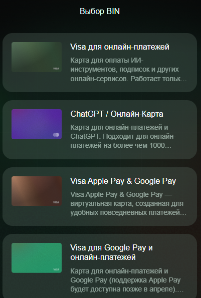 Само оформление происходит через мини-апп в телеграм-боте. В нем внезапно узнаем, что существует целых 4 тарифа, о чем на платформе до этого не говорили. Если же начать изучать варианты, то окажется, что первые два вообще не различаются между собой. В описании второго тарифа почему-то содержится название ChatGPT, хотя этот сервис можно оплатить и с помощью первой карты. Комиссии везде тоже одинаковые, срок действия совпадает, стоимость тоже. Подобная неразбериха в серьезном, казалось бы, сервисе смущает.
