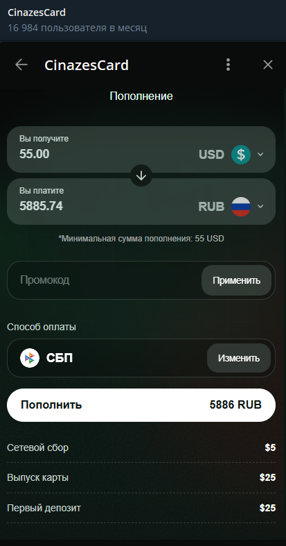Если же пользователь хочет подключить карточку к Apple Pay и Google Pay, то ему нужно будет заплатить в 2 раза больше: 110 долларов вместо 55. Внести деньги можно как через СБП, так и с помощью криптовалюты. Сразу же после оплаты клиенту будут доступны все инструменты, хотя на самом деле это не так.