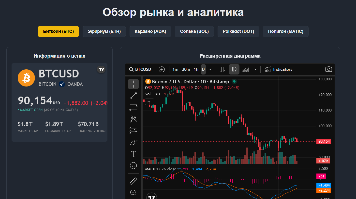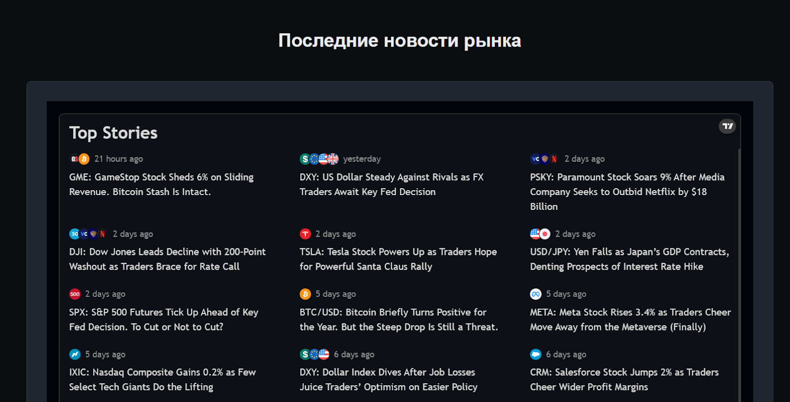 Чуть ниже представлены последние новости финансового рынка. Статьи не просто скопированы со сторонних источников, а ведут напрямую на сайт TradingView. Из-за того, что контент полностью заимствован, раздел новостей теряет свою уникальность, не является источником оригинального анализа или экспертных выводов.