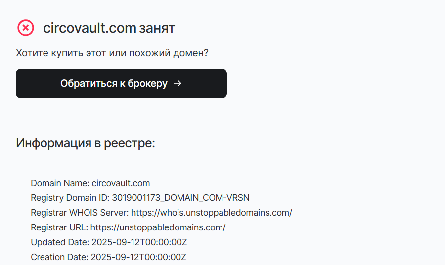 Сайт Circovaultcom был зарегистрирован только в сентябре 2025 года, то есть на 11.12.2025 сервис остается достаточно молодым на рынке. При этом площадка работает только на английском. Другими словами, жители других стран рискуют столкнуться с трудностями перевода условий Circovault, что в конечном итоге может привести к убыткам.