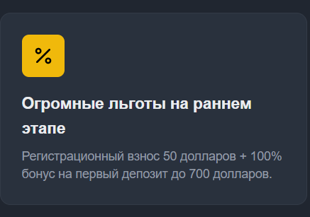 Клиентам компании обещают «приятные» бонусы, но подробно программа не расписана – как и за что их получают, неизвестно. Уточняется только, что при внесении первого депозита на сумму до $700, на баланс вернется 100% кешбека. За саму регистрацию обещают начислить $50.