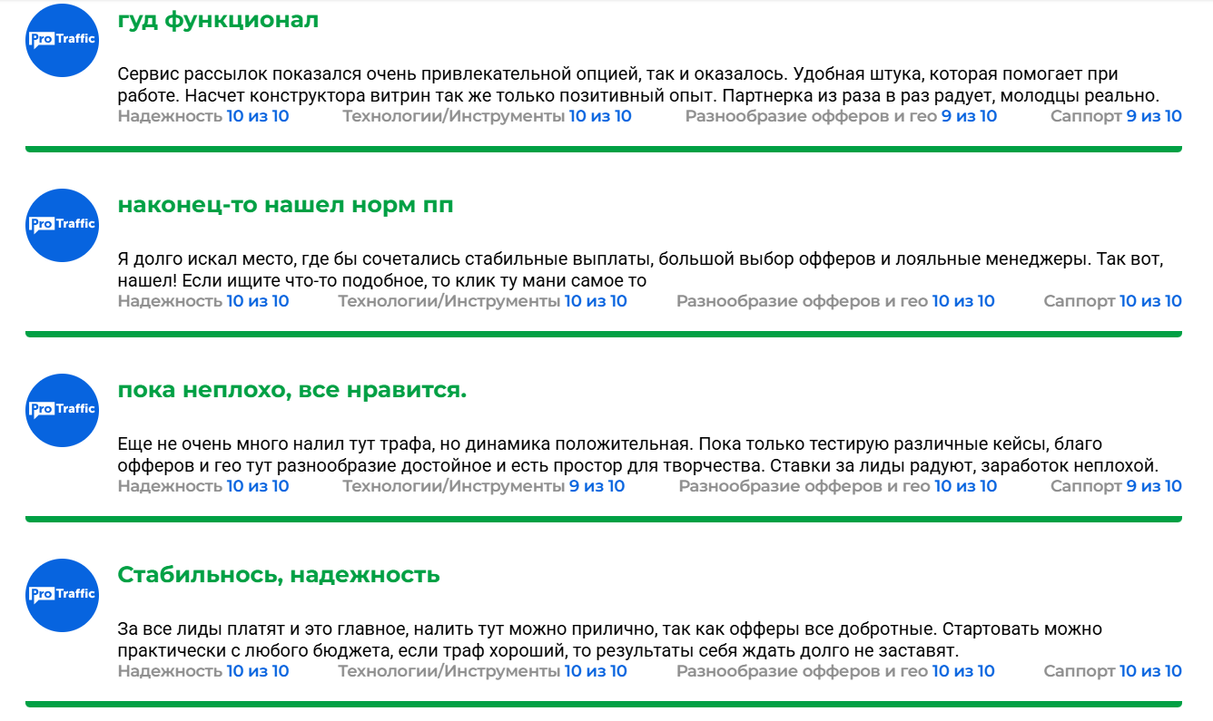 И здесь как раз начинаются реальные вопросы: в отзывах видно, что часть вебмастеров довольна на 10 из 10 и хвалит поддержку, интерфейс, ставку, стабильность и быстрые ответы менеджеров.