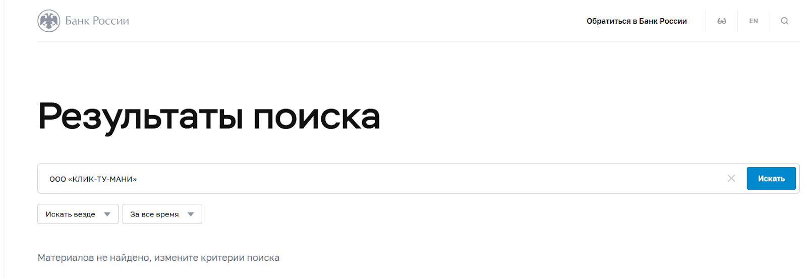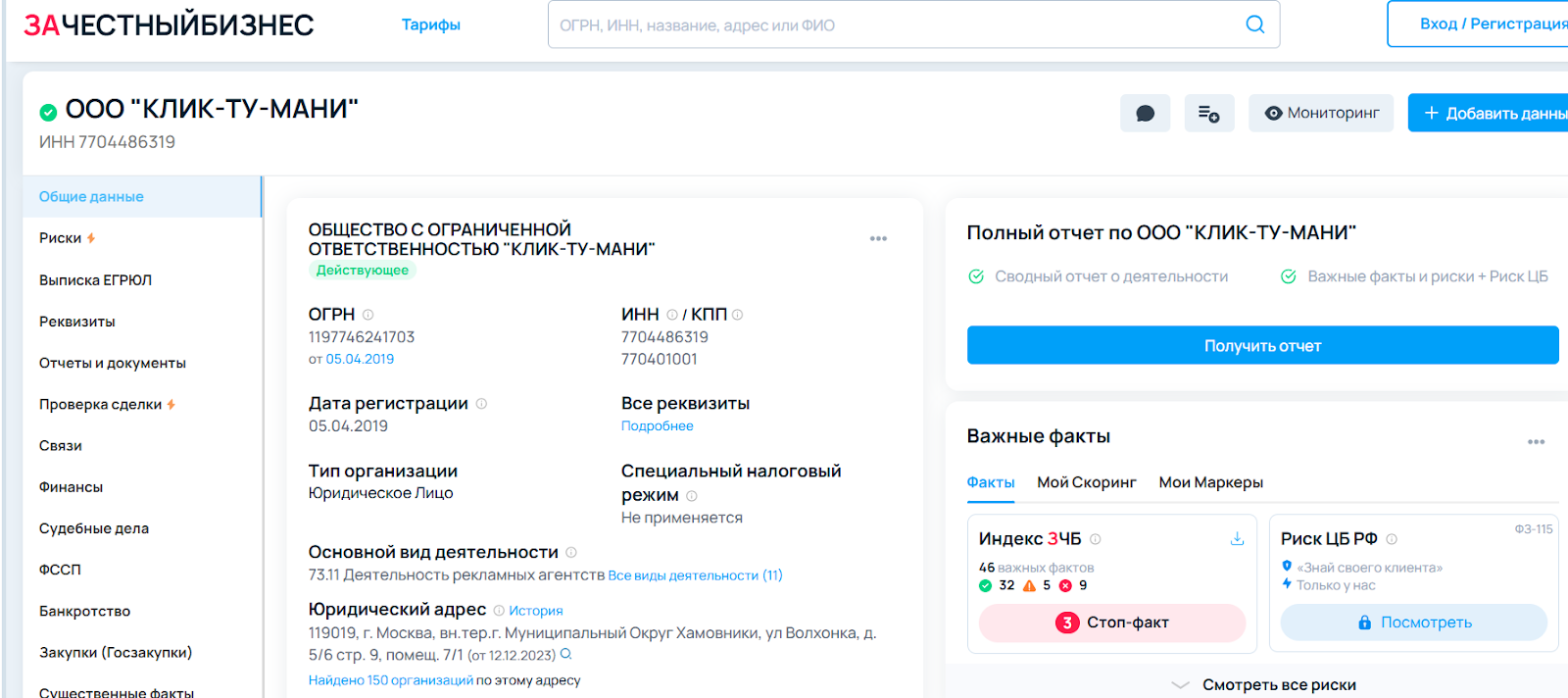 Юридически компания оформлена как ООО “КликТуМани”, зарегистрирована 5 апреля 2019 г. в Москве по адресу 119019, ул. Волхонка, д. 5/6, ИНН 7704486319. При этом адрес входит в категорию массовых и признан недостоверным по данным ФНС, что формально не мешает работе, но для клиента это фактор, который требует повышенного внимания.