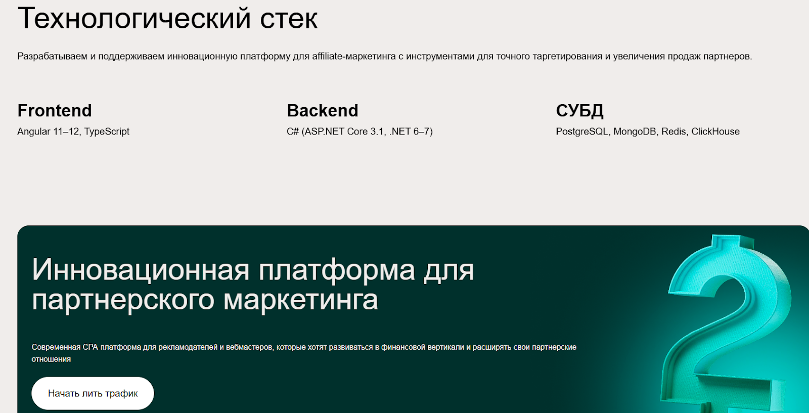 Партнерка начала работать с 2019 г., когда небольшая команда арбитражников решила создать сервис, где профессиональные инструменты, гибкие условия и техническая база будут соединены под одной крышей.