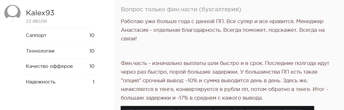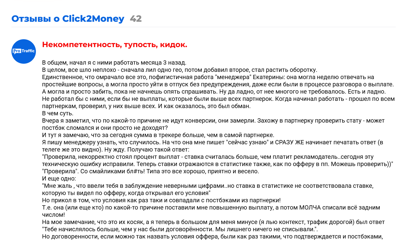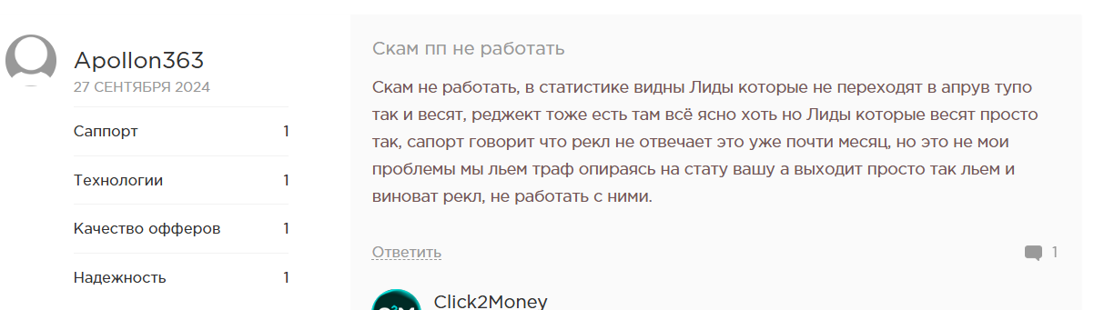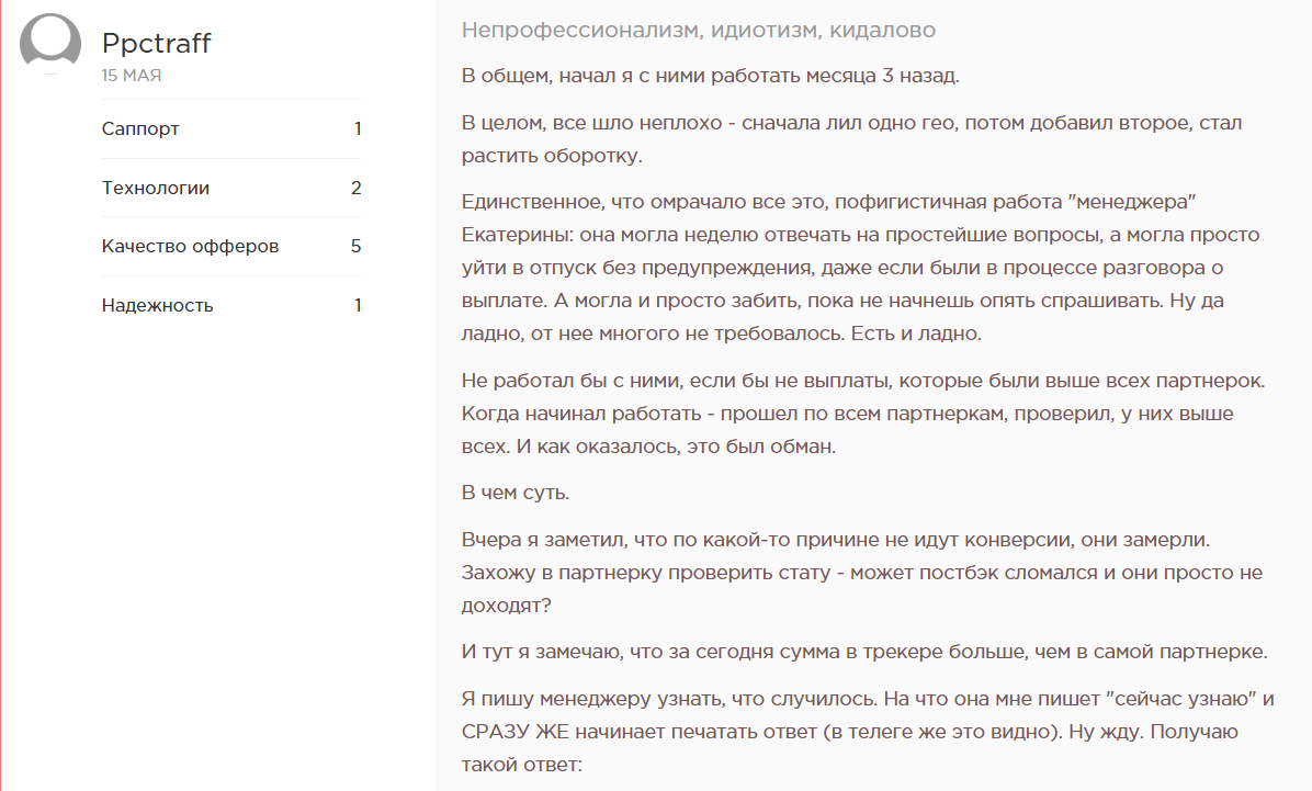 Но другая часть описывает обратную картину: задержки выплат, долгие ответы менеджеров, отсутствие реакции на зависшие лиды, резкое изменение условий или ставок без предупреждения и ситуации, когда технические ошибки по ставкам исправлялись задним числом, из-за чего вебмастеры оказывались в минусе.
