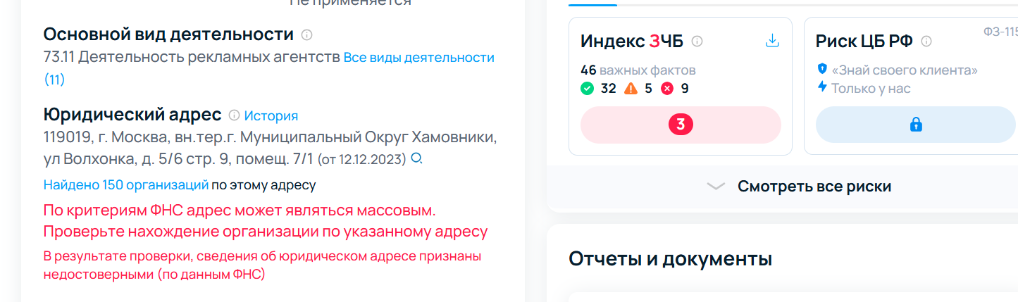 Уставный капитал 10К рублей. Основной вид деятельности 73.11 “рекламные агентства”. Важный нюанс: сервис значится в списке тех, у кого обнаружены недостоверные сведения об адресе, и имеет сообщения на Федресурсе, что не является критичным, но говорит о необходимости дополнительно проверять юридическую сторону перед масштабными оборотами.
