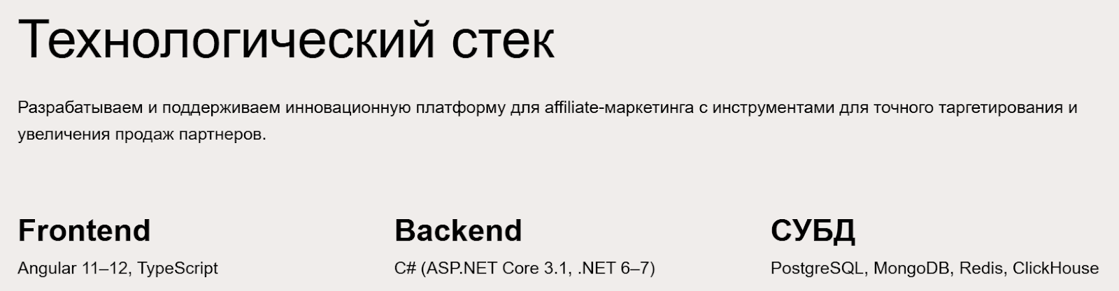 С технической стороны сервис выглядит современно. Платформа работает на собственном backend-стеке, в качестве баз данных используется PostgreSQL, MongoDB, Redis и ClickHouse, а фронтенд построен на Angular 11-12.