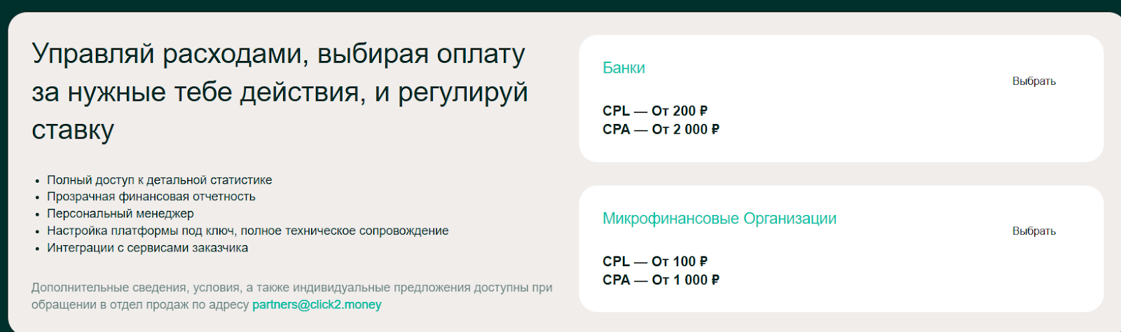 Условия позволяют подбирать формат оплаты: CPA или CPL. Ставки по банкам и МФО держатся на высоком уровне: CPL стартует от 100–200 рублей, CPA от 1000–2000 рублей, и это дает вебмастеру простор для построения стратегий разной глубины.