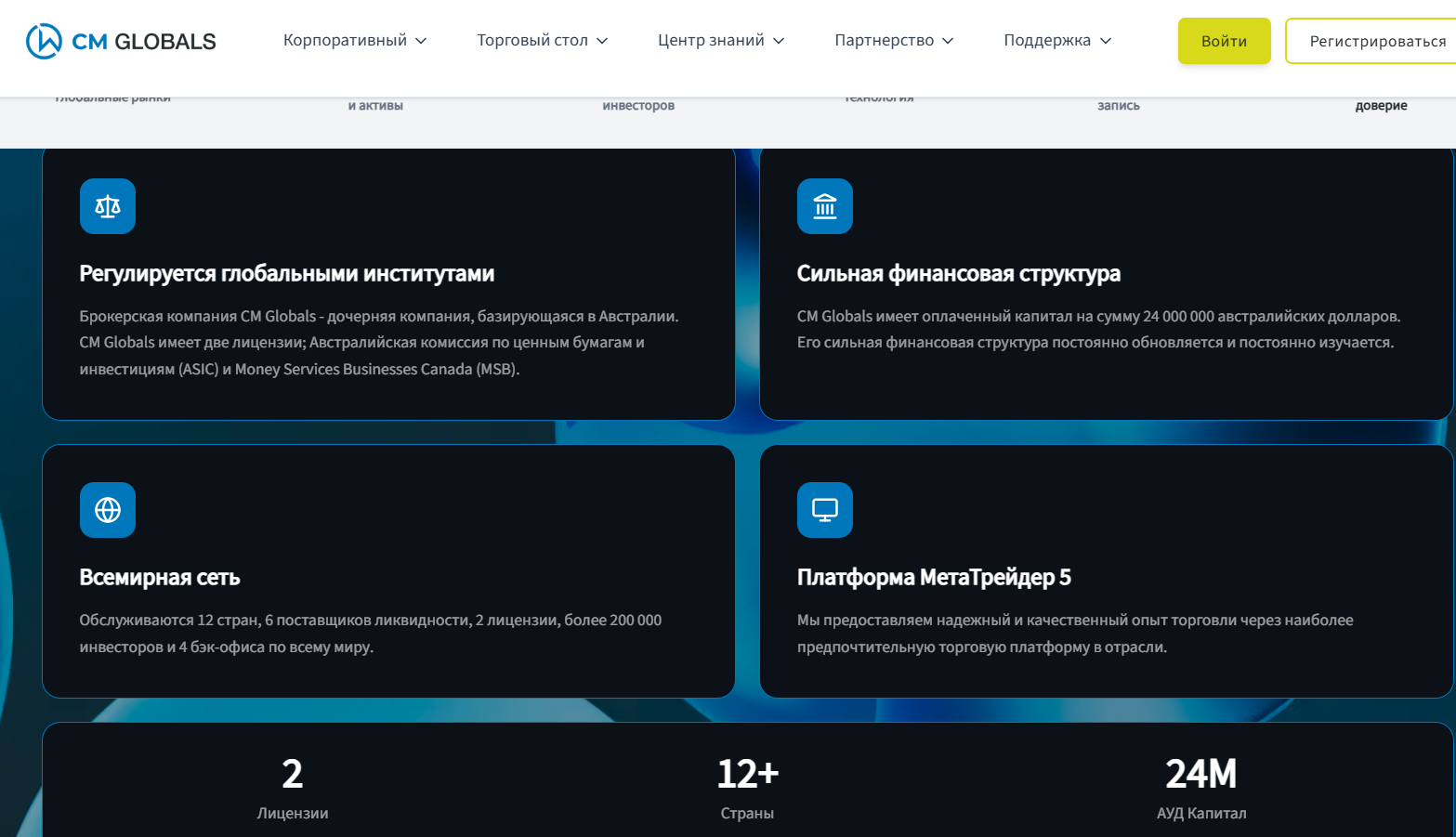 На главной странице сайта CmGlobals com написано, что услугами площадки пользуются 12 стран, а общий капитал платформы $24,000,000. Под этой информацией нет ни ссылок на аудиты, ни подтверждений или источников.