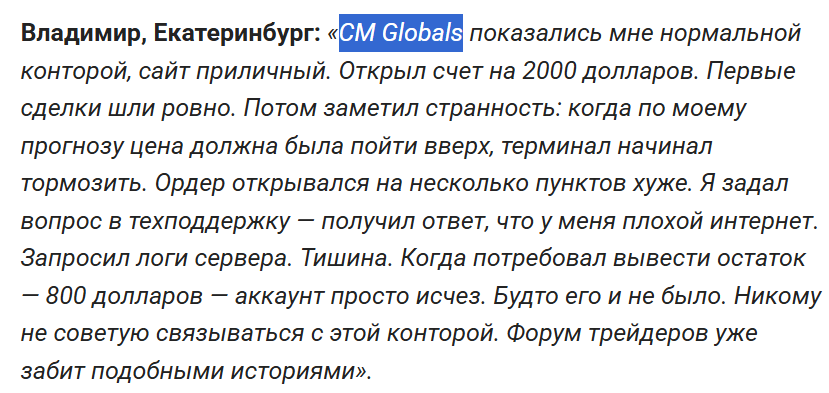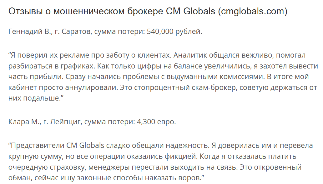 Другие клиенты рассказывают как потеряли на платформе CmGlobals com ₽540,000 и €4,300. Один из пользователей пишет, что все шло хорошо до момента запроса на вывод, после которого кабинет трейдера аннулировали, а деньги остались на площадке. Другая клиентка рассказывает, что на моменте вывода средств от нее потребовали заплатить за страховку, а когда она отказалась, менеджеры пропали.