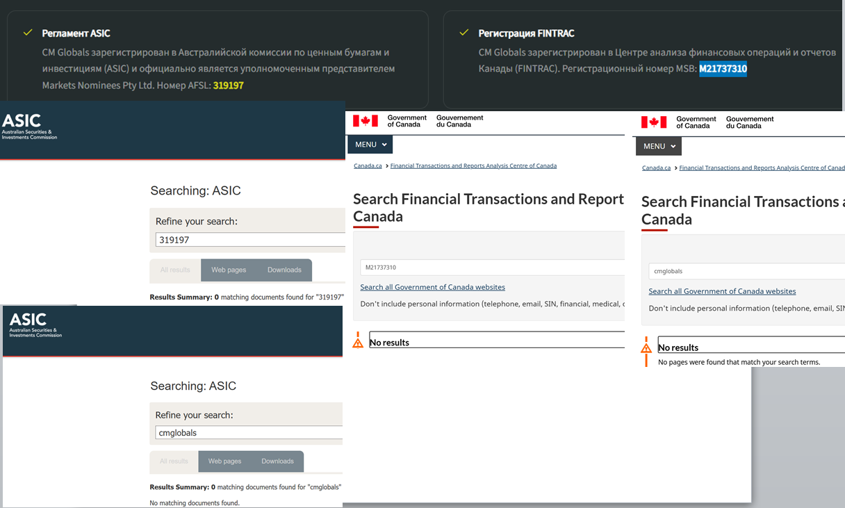 На сайте сказано, что у брокера есть две лицензии – австралийского регулятора ASIC и канадского контролера Fintrac. Проверка на сайтах организаций показала, что ни по номерам бумаг, которые брокер указал на сайте, ни по названию сервиса, у площадки нет лицензий этих регуляторов.