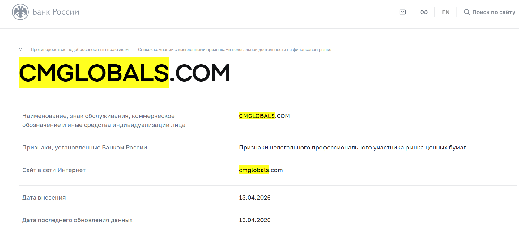 Центробанк РФ вывесил предупреждение о брокере CmGlobals. В апреле 2026 года регулятор написал, что у сервиса есть признаки того, что он работает нелегально и услуги брокера на рынке ценных бумаг могут быть мошенничеством.