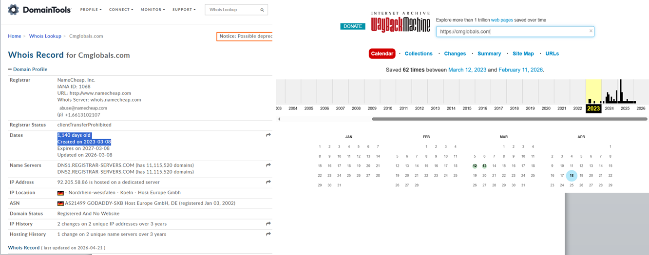 По данным карточки Whois домен сайта CmGlobals com зарегистрировали в марте 2023 года. Архивы WaybackMachine подтверждают, что ресурс запустили в этот период и портал изначально занимался инвестициями и трейдингом.