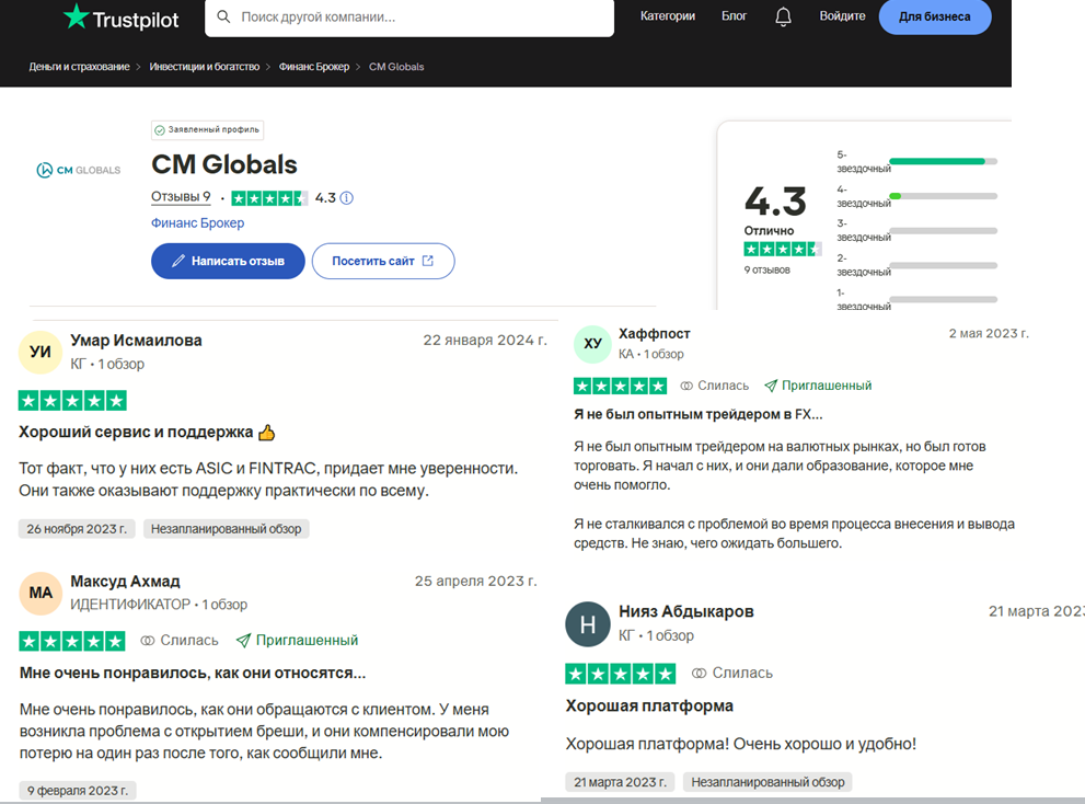 На портале Trustpilot у брокера рейтинг в 4,3 балла из пяти возможных и много положительных отзывов о CmGlobals com. Люди хвалят сервис и поддержку, а некоторые пишут, что две лицензии внушают уверенность. Большинство откликов состоит из общих фраз и оценок без цифр, фактов и деталей операций.