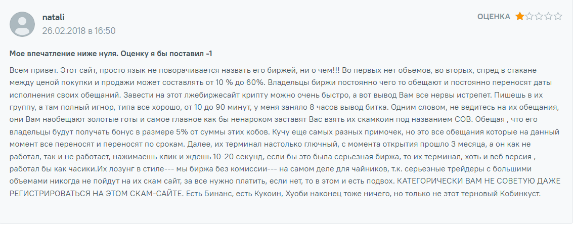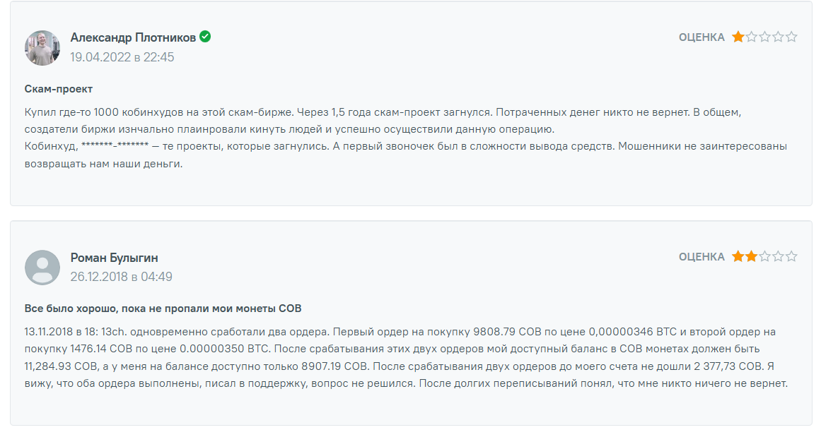 Кобинхуд биржа, которая сдохла в 2020 году! Я влетел на 0.5 BTC, когда они ещё работали. Сначала торговал норм, потом выводы зависли! Саппорт винил техработы, а потом сайт накрылся! Где мои деньги? Тупо кинули, как последних лохов. Теперь их группа в ВК мертвая, только негатив в отзывах. Пипец, а не проект!