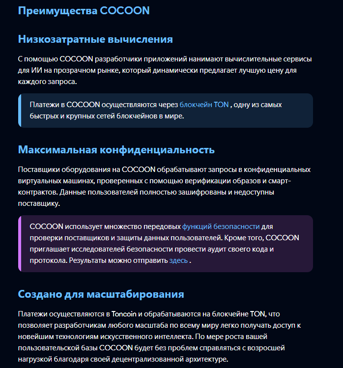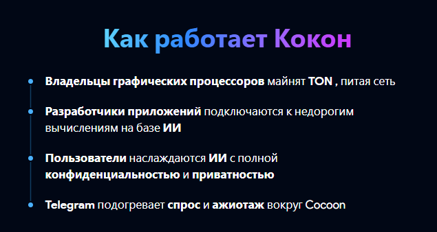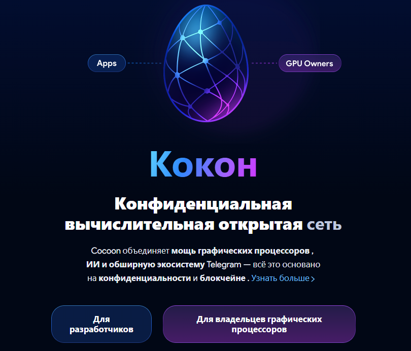 Сеть «Кокун» от Павла Дурова объединяет владельцев графических процессоров, предоставляющих вычислительные мощности, и разработчиков, отвечающих за вывод данных с помощью ИИ. Все взаимодействия и расчеты осуществляются через блокчейн TON. Смарт-контракты фиксируют, кто и сколько ресурсов предоставил, а вознаграждения выплачиваются в токенах Toncoin (TON).