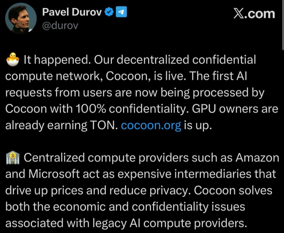 Павел Дуров анонсировал проект Cocoon (Confidential Compute Open Network) на октябрьском форуме Blockchain Life 2025 в Дубае. С тех пор у участников криптосообщества возникает немало вопросов касательно нового сервиса.