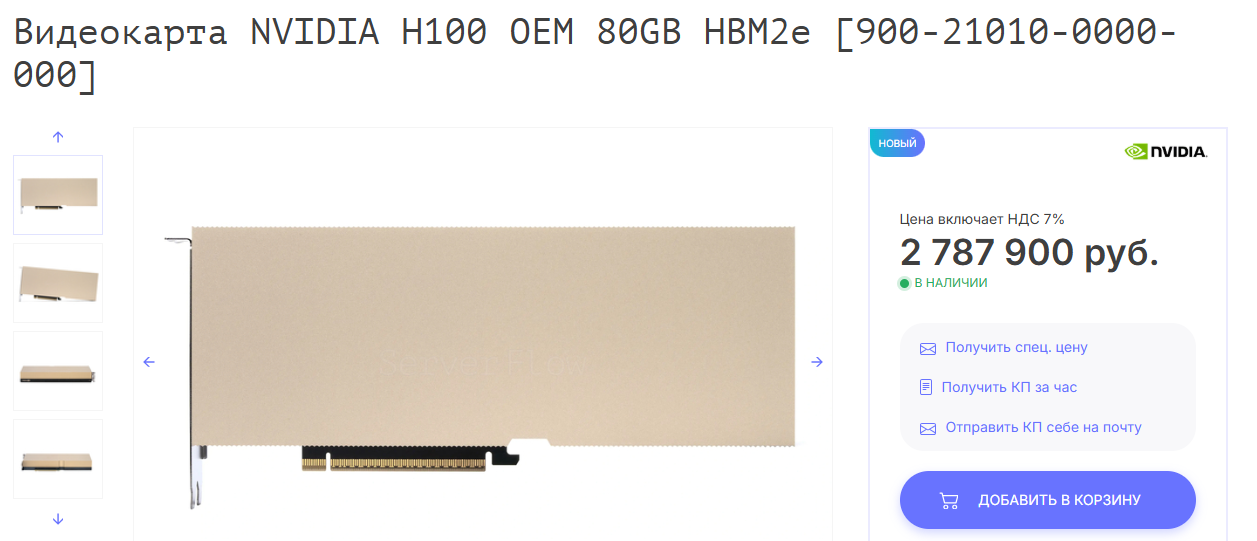 Например, можно использовать NVIDIA H100 PCIe на 80 ГБ, стоимость которой составляет около 25 тысяч долларов.