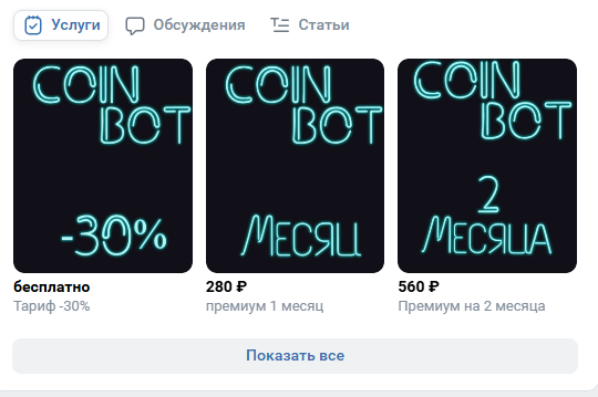 В Coin Bot Чат Менеджер Монетайзер Чата ВК пользователям предлагается несколько тарифных вариантов: