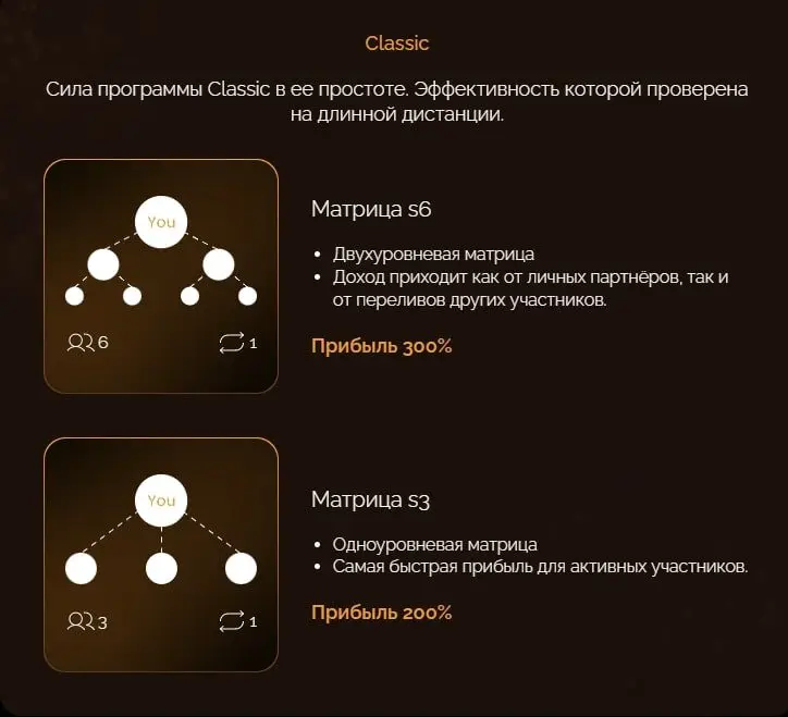 Пользователям предлагали вкладываться в двухуровневую или одноуровневую матрицу, привлекать новых вкладчиков для того, чтобы они смогли получить с них прибыль. Получается, что человек, который звал трех пользователей, зарабатывал с них 200% от суммы инвестиций. Еще 100% уходили непонятно куда.